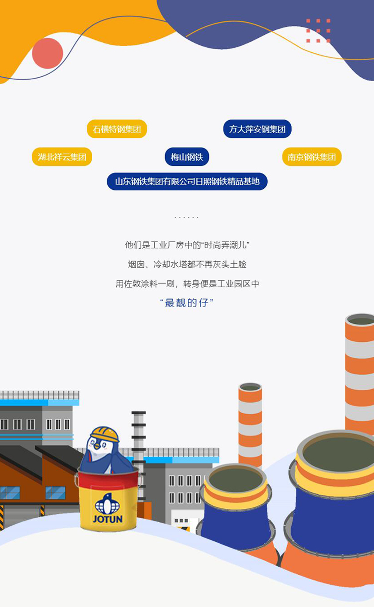 佐敦涂料攜手在業(yè)內(nèi)擁有超過30年高空施工經(jīng)驗的施工團隊,為各類正在轉(zhuǎn)型的鋼鐵企業(yè)提供維修、防腐、美化服務。佐敦為此類美化服務提供專業(yè)的油漆配套,鋼廠美化專用的高性能涂料體系,不僅可以配合施工隊的快速施工,而且調(diào)色方便、調(diào)色空間大,能基于環(huán)保的基礎上更方便、精準地展現(xiàn)出業(yè)主及設計師的設計理念。